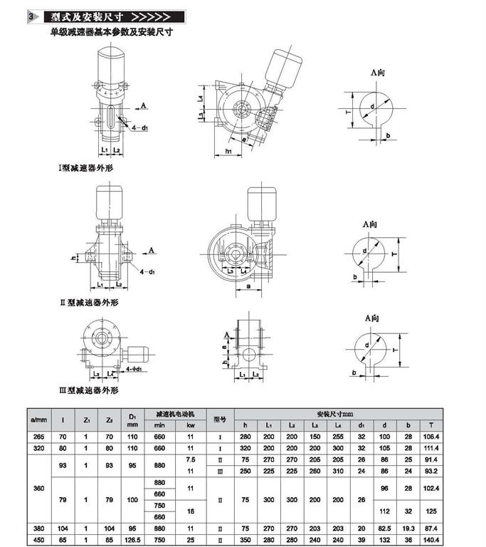 單級減速器中心距:265mm,320mm,360mm,380mm,450mm。